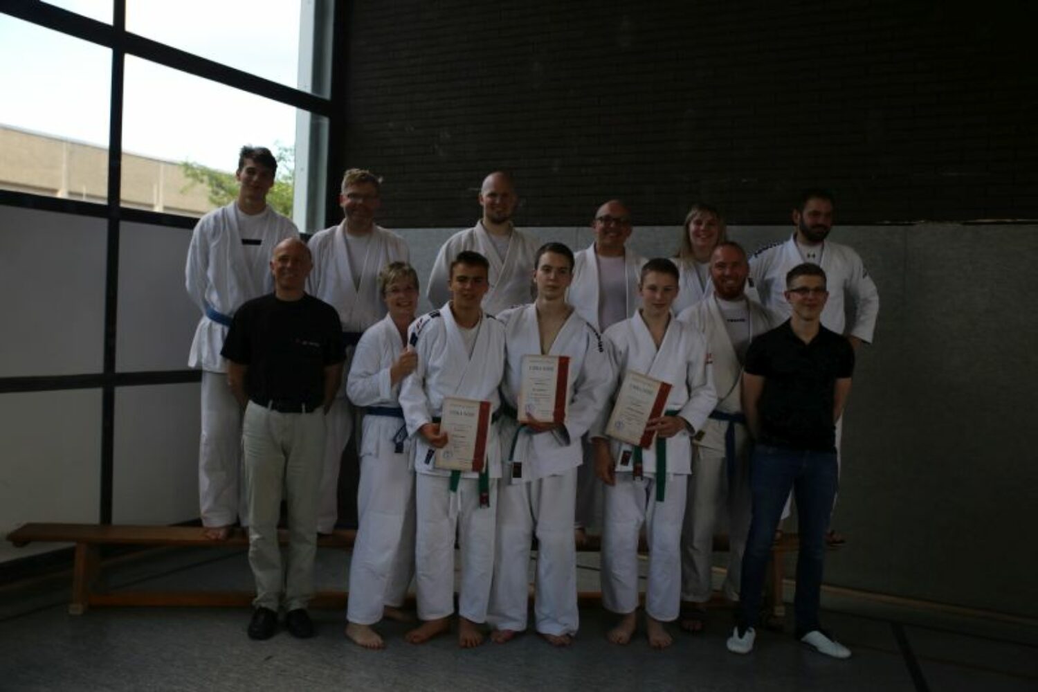 Mindestens ein halbes Jahr Vorbereitungszeit brauchen die Ju-Jutsukas um durch intensives Training ihr Prüfungsprogramm zu perfektionieren. Dazu gehört unter anderem die Fallschule, Schlag- und Tritttechniken, Bodentechniken, Sicherungstechniken,Würfe, so wie Abwehrtechniken gegen Waffen wie Stock, Messer oder Kette. Des weiteren wollten die Trainer sehen: Weiterführungstechniken, wenn der Gegner Techniken nicht zulässt, Gegentechniken gegen Hebel- oder Wurftechniken des Gegners, freie Selbstverteidigung und freie Anwendungsformen was dem Ju-Jutsu-Wettkampf entspricht. Nach über fünf Stunden verkündeten die Prüfer dass die Leistungen teilweise gut, teilweise sogar sehr gut waren und dass alle Ju-Jutsukas ihre Prüfung bestanden haben. Vom TV87 Stadtoldendorf dürfen jetzt den Blaugurt tragen: Dennis Rimer, Jannik Hoffmann und Jan Scheffel. Über den Braungurt freuen sich Anke Jünemann und David Haupt.