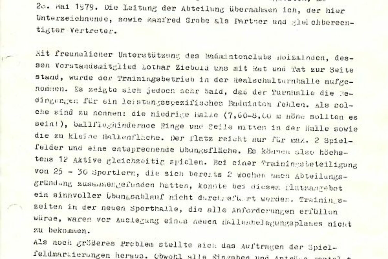 Am 14.05.1979 fand die offizielle Gründung, der Badmintonabteilung des TV 87 Stadtoldendorf, durch den damaligen Vorsitzenden Albert Eckhardt statt. Die Initiative kam von Rainer Linck, der zusammen mit Manfred Grobe auch die Leitung der neuen Abteilung übernahm. Bereits nach einem Jahr wurde am Punktspielbetrieb teilgenommen. Seit 1984 bis heute spielen zwei Mannschaften im Badmintonkreis Hildesheim / Holzminden um Punkte und Meisterschaft mit. 1989 wurde Manfred Grobe Abteilungsleiter.