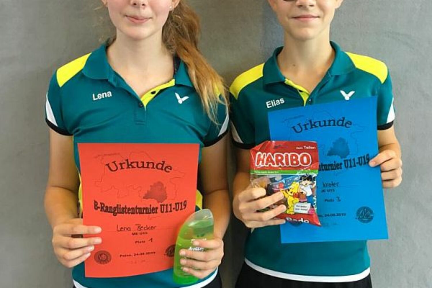 Da es nur geringe Anmeldungen pro Altersklasse gegeben hatte, entschied der Ausrichter die Zusammenlegung von Altersklassen und das Spielen in Gruppen. Dadurch hatten Lena vier und Elias fünf Begegnungen zu spielen. Lena gewann ihr erstes Spiel souverän in zwei Sätzen, hatte jedoch im zweiten Spiel um einiges mehr zu kämpfen. Sie spielte gegen eine Spielerin vom SVN Buchholz. Schon von Beginn an machte sie Druck, indem sie Lena versuchte an der hinteren Grundlinie zuhalten. Den ersten Satz gewann sie dann schließlich auch mit 21:18. Im zweiten Satz änderte Lena ihre Taktik und konnte somit den zweiten Satz mit 21:13 für sich entscheiden. Der dritte Satz war recht ausgeglichen. Es schaffte keine Spielerin sich abzusetzen. Kurz vor Ende stand es dann 17:18 für die Spielerin vom SVN Buchholz. Mit der Motivation von Betreuer Jurij Kroter, der Lena immer wieder zurief „nur noch vier Punkte“ konnte sie dieses Spiel noch mit 21:18 gewinnen. Ihre beiden letzten Begegnungen konnte sie dann wieder recht glatt in zwei Sätzen gewinnen und sicherte sich somit den 1. Platz.