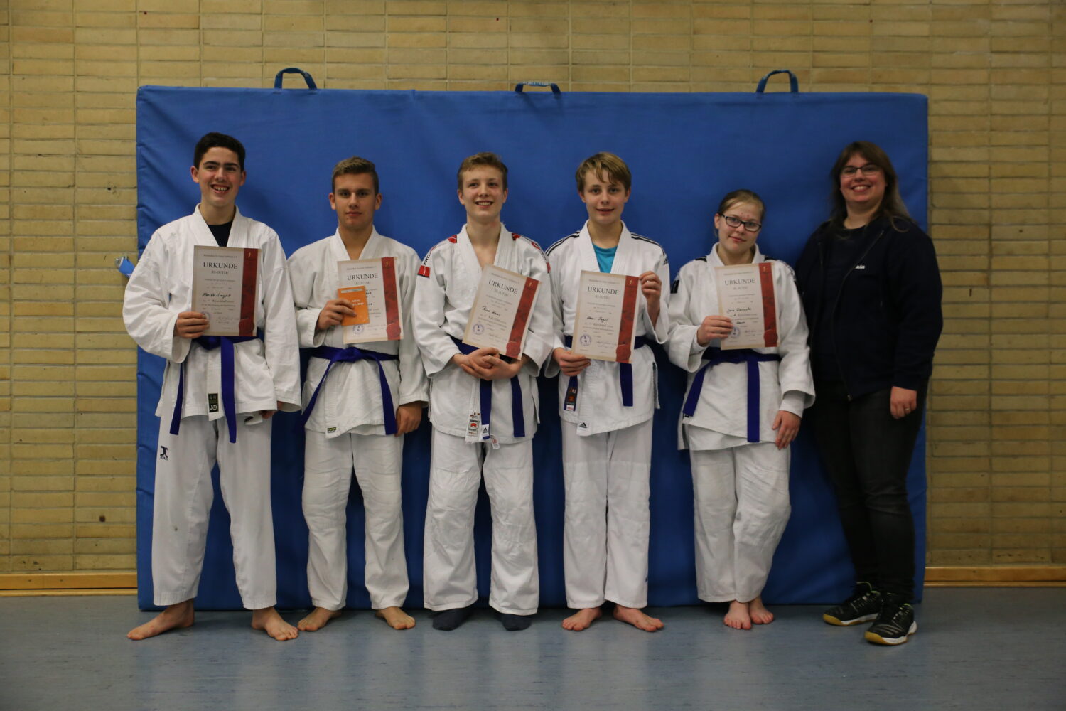 Trotz ein paar Kritikpunkten waren die Prüfer am Ende mit der gezeigten Leistung zufrieden und gaben bekannt, dass alle 27 Teilnehmer der Bezirksprüfung bestanden haben. Darunter auch die fünf Ju-Jutsuka aus Stadtoldendorf. Jana Warnecke, Henri Rogel, Rico Haas, Maico Heise und Moritz Siegert nahmen die Glückwünsche und die Urkunde von den Prüfern freudig entgegen und dürfen nun