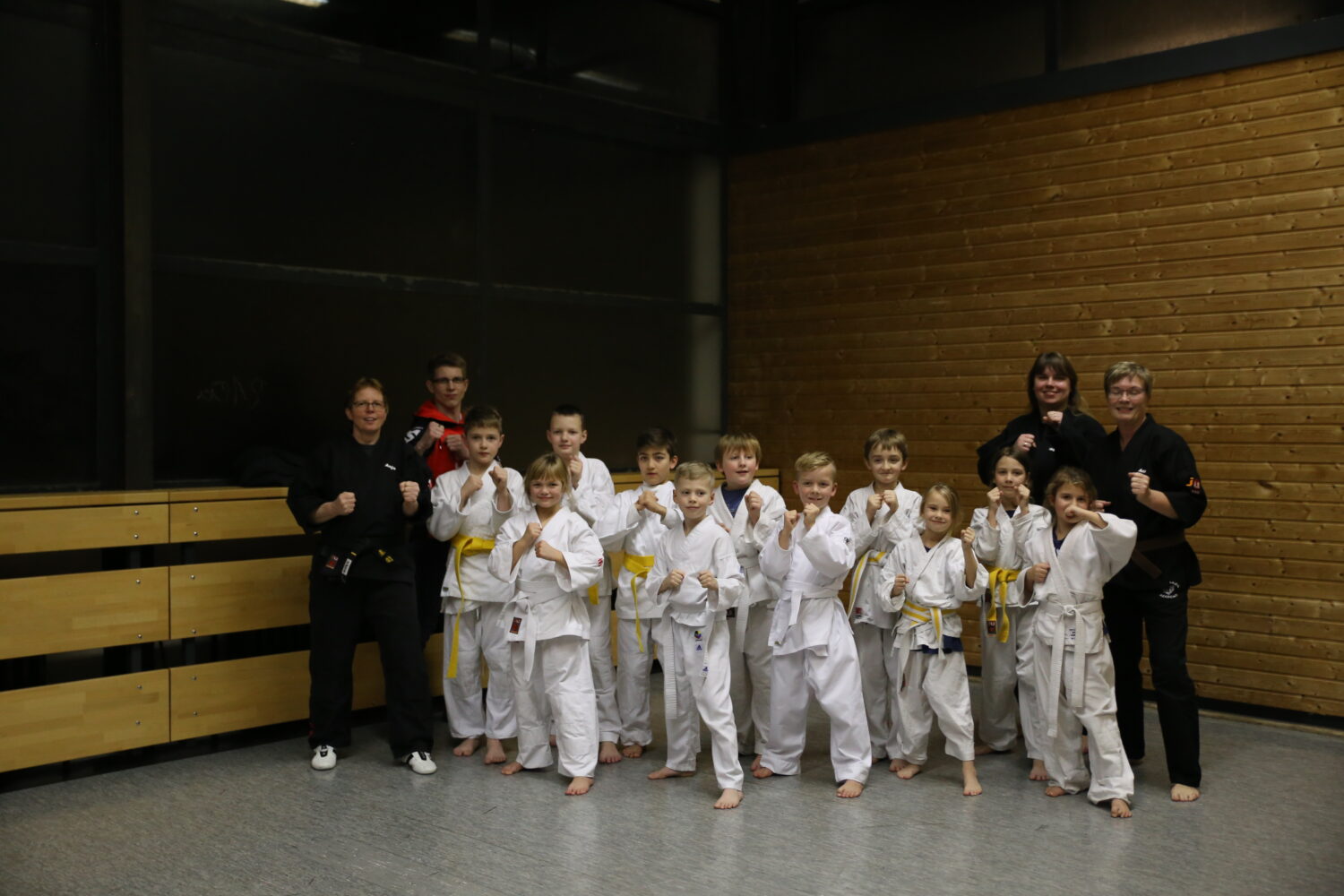 Gut vorbereitet von den Trainern Saskia Anders, Anke Jünnemann und Anja Haas konnten die Kids ihre erlernten Techniken abrufen. Im Bereich des gelben Drachen bis Vollgelbgurt geht es um die Basics der verschiedenen Kampfstellungen, Bewegungslehre, Fallschule und die ersten Ju-Jutsu-Techniken wie Griff lösen, Griff sprengen und Festlegetechniken. Besonders viel Spaß hatten die Ju-Jutsu-Minis am Schluss bei den freien Anwendungsformen. Hier versuchen beide Gegner mit Atemitechniken, hier noch mit offenen Händen, durch die Deckung des anderen durchzukommen und den Oberkörper zu treffen. Der Prüfer war mit dem Gezeigten zufrieden und beglücktwünschte alle zur bestandenen Prüfung.