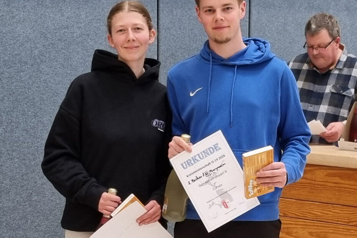 Im Mixed-Doppel der Klasse B sah es dann schon anders aus. Es gab insgesamt drei Doppelpaare und eins davon stellte der TV 87 mit Lena und Niklas. Im ersten Spiel musste man direkt gegen Lena ihre Doppelpartnerin, die mit ihrem Vater Ulli Koch (beide TV Bodenwerder) zusammen spielte. Es war eine umkämpfte Partie, die am Ende Lena und Niklas knapp mit 2:1 gewannen und somit den Grundstein legten für den Kreismeistertitel der B-Klasse im Mixed.